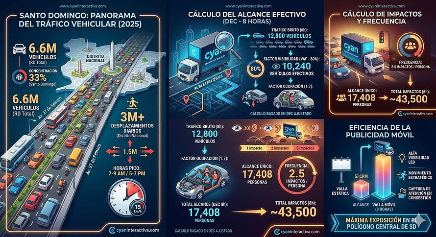 Factor de Ocupación: En RD se estima en 1.5 a 1.8 personas por vehículo.ntral puede generar entre 35,000 y 50,000 impactos totales diarios.